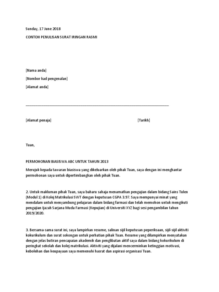 CONTOH PENULISAN SURAT IRINGAN RASMI Nama anda Nombor kad pengenalan Alamat anda _____ Alamat penaja Tarikh Tuan PERMOHONAN BIASISWA ABC UNTUK TAHUN 2013 Merujuk kepada tawaran biasiswa yang dikeluarkan oleh pihak Tuan saya dengan ini menghantar permohonan saya untuk dipertimbangkan oleh pihak Tuan. Cik Auni Binti Ismail adalah seorang pelatih yang menjalani Latihan Ilmiah di Jabatan Cetak Kerajaan. Contoh Surat Pengesahan Untuk Buka Akaun Bank Contoh Surat.